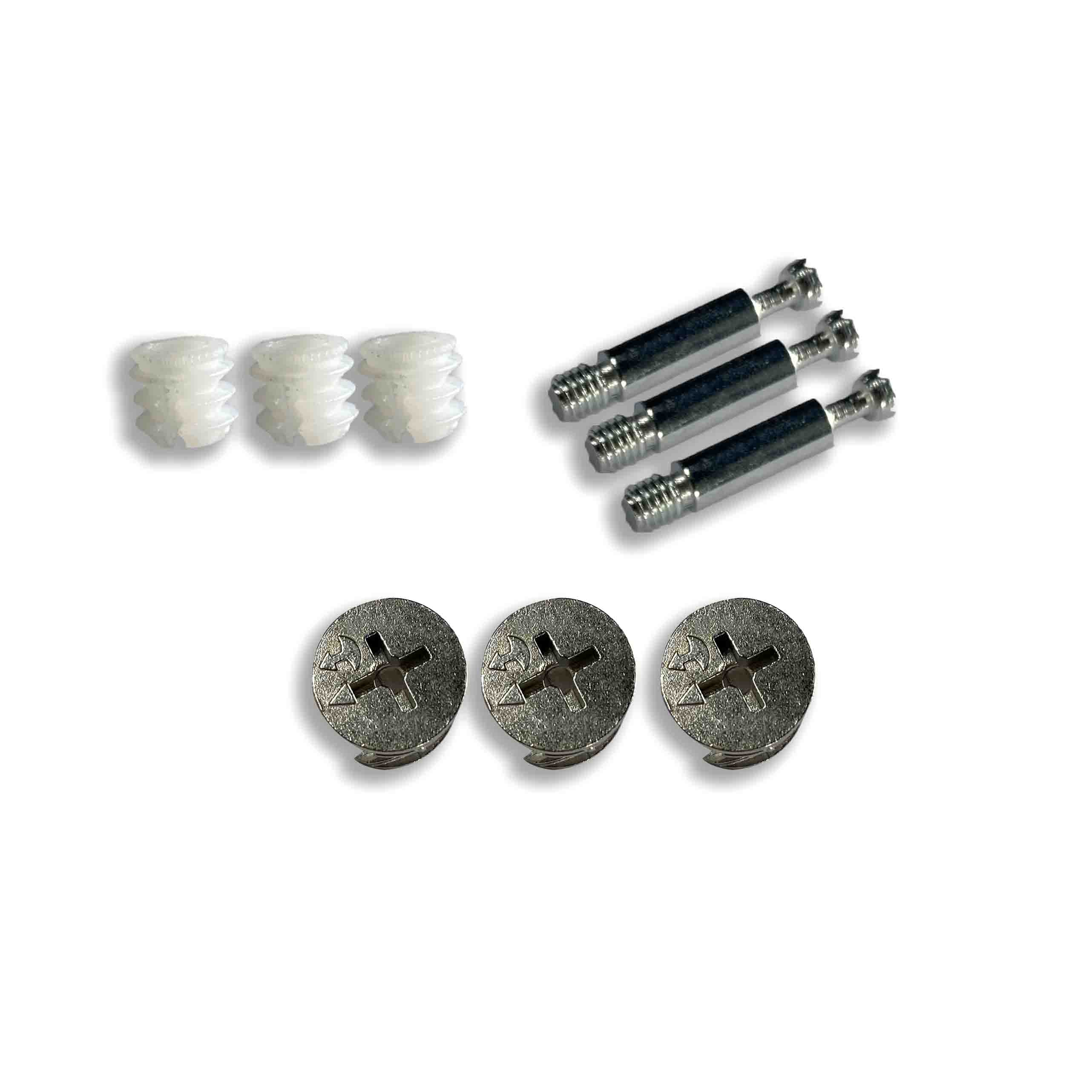 Ốc liên kết 3 bộ phận này bao gồm các bộ phận bằng nhựa và các bộ phận hợp kim kẽm và vít, có thể ứng dụng làm cho các tấm gỗ tủ đồ nội thất có khả năng chịu lực mạnh hơn, và các ốc vít có độ cứng cao, giúp tiết kiệm thời gian và công sức trong quá trình lắp đặt. Bánh xe lệch tâm hợp kim kẽm không dễ bị vỡ và khóa chắc chắn.