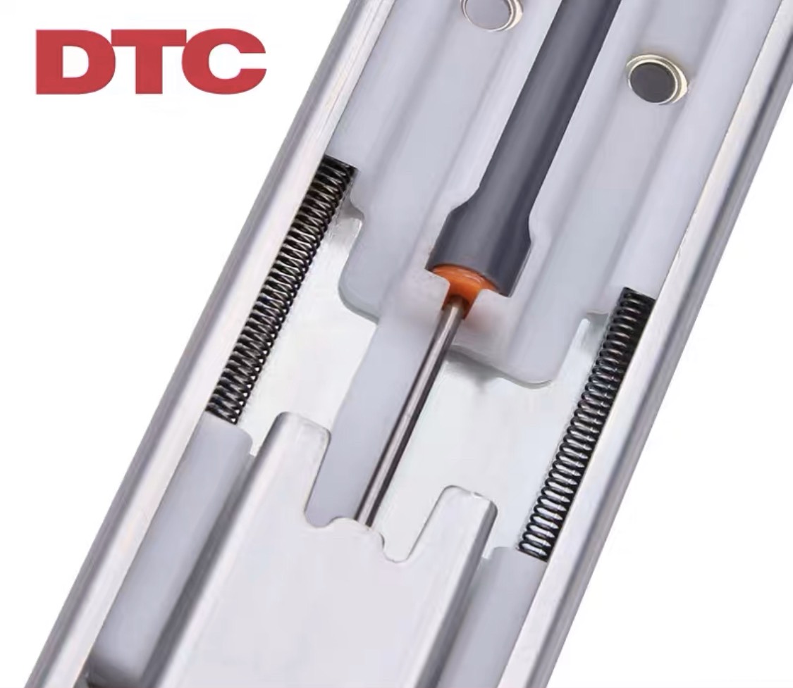 Ray trượt bi DTC 3 tầng giảm chấn được cải tiến từ dòng ray trượt bi thông thường thêm bộ cơ cấu piston giảm chấn. Với lực cản chậm của piston dầu làm ngăn kéo đóng chậm lại nên không gây ra tiếng động.