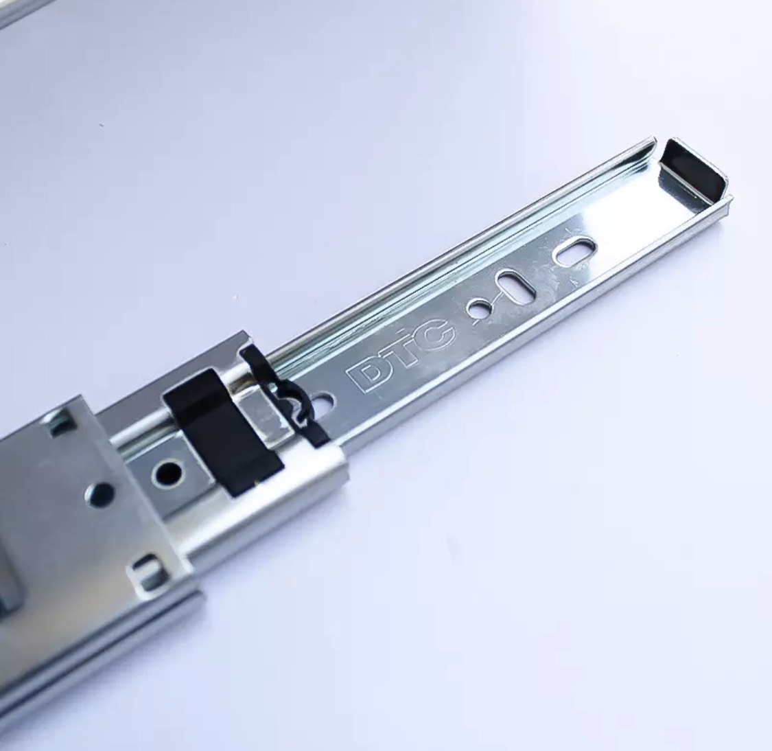 - Ray trượt bi DTC 3 tầng giảm chấn giúp cho tủ bếp thêm bền bỉ hơn bởi chúng không va chạm mạnh trong quá trình đóng mở. Hơn nữa, cũng an toàn đối với những gia đình có trẻ nhỏ.